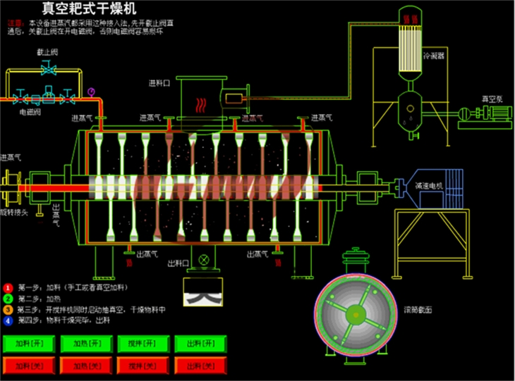 1. 本干燥设备是在引进吸收国内耙式干燥技术的基础上改进的一种新颖卧式间歇式真空干燥设备,湿物料经传导蒸发,带有刮板搅拌器不断清除热面上的物料,并在容器内推移形成循环流,水分蒸发后由真空泵抽出。