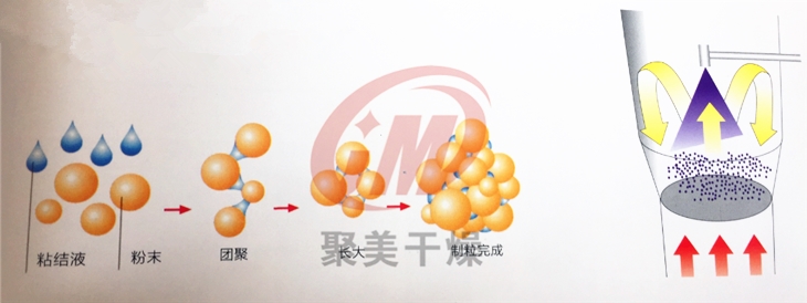 物料粉末粒子,在原料容器(流化床)中呈循环流化状态,受到经过净化后的加热空气预热和混合,将粘合剂溶液雾化喷入,使若干粒子聚集成含有粘合剂的团粒,由于热空气对物料的不断干燥,使团粒中水分蒸发,粘合剂凝固。此过程不断重复进行,形成理想的、均匀的多微孔球状颗粒。
