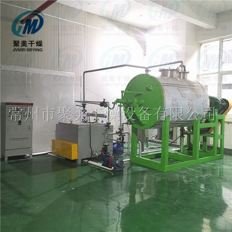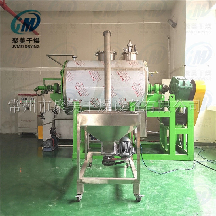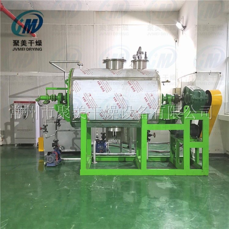 本机是一种新颖卧式间歇式真空干燥设备,湿物料经传导蒸发,带有刮板搅拌器不断清除热面上的物料,并在容器内推移形成循环流,水份蒸发后由真空泵抽出。