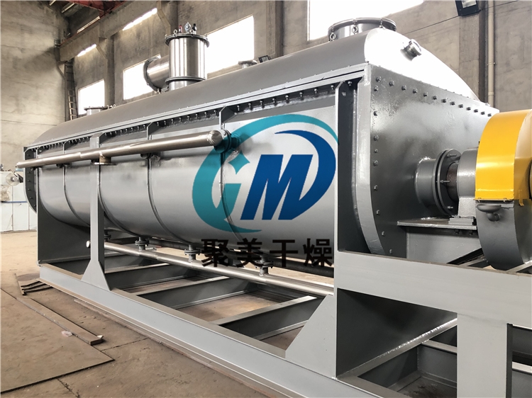 市政污泥烘干机是一种以热传导为主的卧式搅拌型干燥机,其主体结构为,带有夹套的W型壳内装有成对的空心低速回转中空轴,轴上焊接若干搅拌中空叶片,夹套和空心搅拌叶片内均通以热载体,两种加热面同时对物料加热,因此,该机型比一般传导式干燥机具有更突出的传热速率,按需要,本形式干燥机可设计成双轴或多轴式。热风通常由干燥机中部送入,通过呈搅拌状态的物料层表面,从另一侧排出。。加热介质可以用蒸汽、热水,或高温导热油。