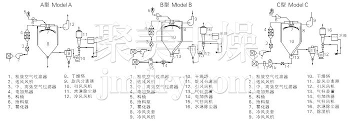 该机采用全封闭形式,所有部件均采用不锈钢制造,配有三级净化装置,过滤后的空气达十万级要求。筒体与顶部装有冷壁装置,使壁温<80℃,干燥塔内装有气刷扫塔装置。经该机干燥后的中药浸膏粉,不会出现焦化变质现象,大大增加了收粉率(95%以上),而且不会产生混药现象和粘壁现象。