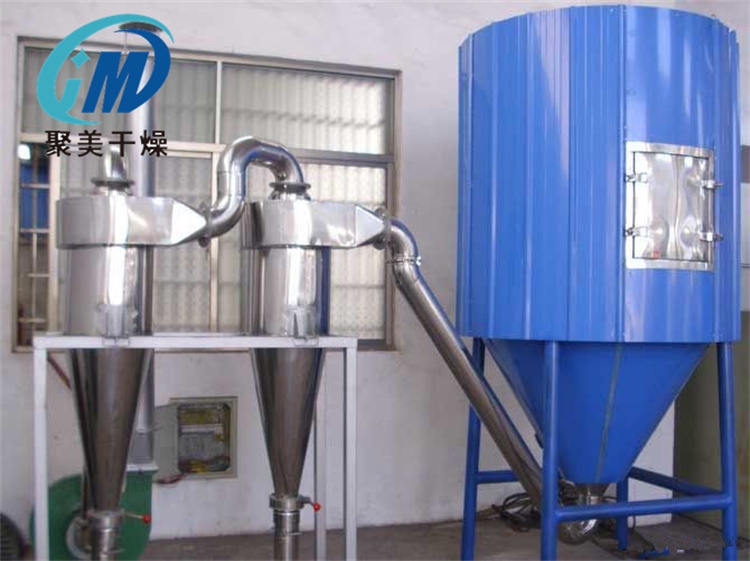 该机采用全封闭形式,所有部件均采用不锈钢制造,配有三级净化装置,过滤后的空气达十万级要求。筒体与顶部装有冷壁装置,使壁温<80℃,干燥塔内装有气刷扫塔装置。经该机干燥后的中药浸膏粉,不会出现焦化变质现象,大大增加了收粉率(95%以上),而且不会产生混药现象和粘壁现象。