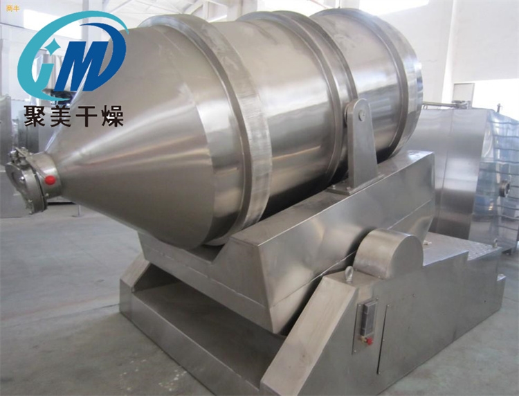 二维混合机全称二维运动混合机,顾名思义,是指旋转的滚筒能同时进行两个方向运动的混合机。这两个运动方向是滚筒的旋转,转筒随摆动架的摆动。被混合物料随着旋转筒的转动、翻转和混合的同时又随转筒的摆动而发生左右来回的掺混运动,在这两个运动的共同作用下,物料在短时间内完全混合。