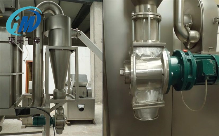 微粉碎机通过进料口螺旋送料器,将物料送入机体和导流圈之间的粉碎室。在粉碎室内被高速旋转的刀片冲击下,使物料甩向固定在机体上的齿圈,产生冲击、剪切,以及物料与刀片、齿圈之间的相互碰撞、摩擦、剪切进行交替粉碎。粉碎后的物料在负压气流的拉力作用下,小粉粒克服重力,随气流越过导流圈,进入分级室,分级叶轮由叶片组成,高速旋转的叶片产生与负压相反的离心力,沉入叶道内的粉粒同时受到负压气流的向心力、粉粒自重及叶轮产生的离心力的作用,粉粒中大于临界直径(分级粒径)的颗粒因质量大,被甩回粉碎室继续粉碎,小于临界直径的颗粒经排粉管进入旋风分离器实现固体颗粒与空气的分离通过闭风器流出,分级叶轮的旋转速度越高分级的粉粒越细。调节分级叶轮的旋转速度是控制粉粒大小的决定因素。