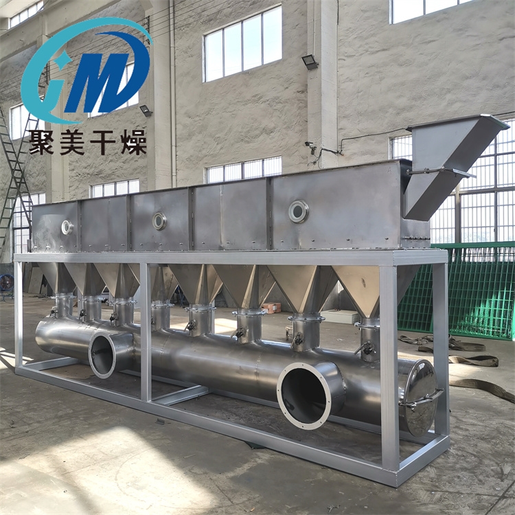 洁净的热风经阀板分配进入床体内,从加料器进入的湿物料被热风形成沸腾状态。由于热风与物料广泛接触,增强了传热传质的过程,因此在较短时间内就可干燥。如用连续型,物料从床体的一头进入,经过几十秒至几分钟沸腾干燥,自动从床体另一头流出。本设备一般进行负压操作。