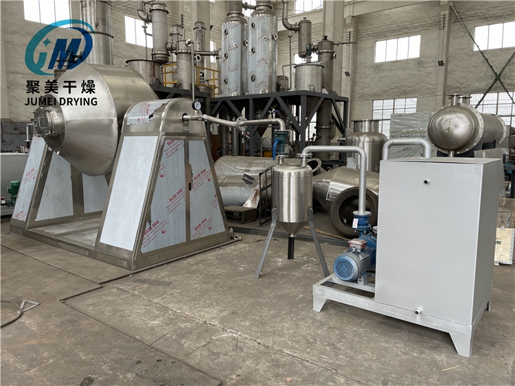 双锥干燥机为双锥形的回转罐体,罐内在真空状态下,向夹套内通入蒸汽或热水进行加热,热量通过罐体内壁与湿物料接触。湿物料吸热后蒸发的水汽,通过真空泵经真空排气管被抽走。由于罐体内处于真空状态,且罐体的回转使物料不断的上下、内外翻动,故加快了物料的干燥速度,提高干燥效率,达到均匀干燥的目的。