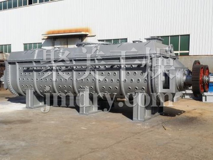 空心轴上密集排列着楔型中空浆叶,热介质经空心轴流经浆叶。单位有效容积内传热面积很大,热介质温度从-40℃到320℃,可以是水蒸汽,也可以是液体型:如热水、导热油等。间接传导加热,没有携带空气带走热量,热量均用来加热物料。热量损失仅为通过器体保温层向环境的散热。楔型浆叶传热面具有自清洁功能。物料颗粒与楔型面的相对运动产生洗刷作用,能够洗刷掉楔型面上附着物料,使运转中一直保持着清洁的传热面。浆叶干燥机的壳体为Ω型,壳体内一般安排二到四根空心搅拌轴。壳体有密封端盖与上盖,防止物料粉尘外泄而充分发挥作用。